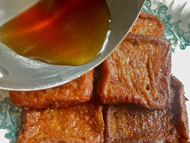 Por último vierte la mitad del almíbar sobre las torrijas y déjalas unos minutos para que lo absorban bien, tras esto dales la vuelta y vierte sobre las torrijas el resto del almíbar.