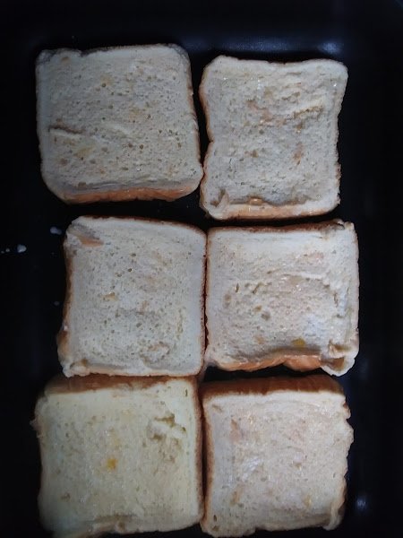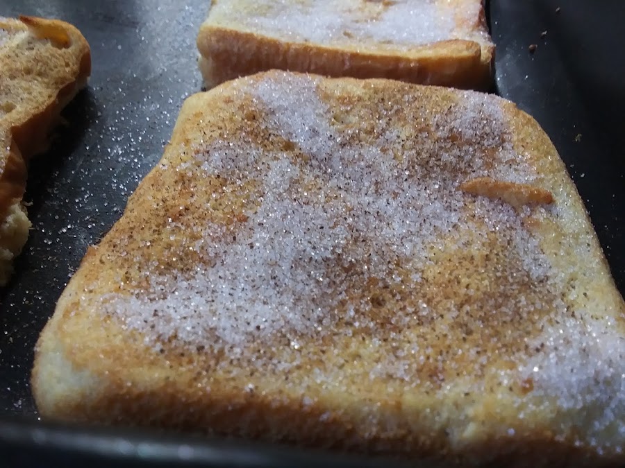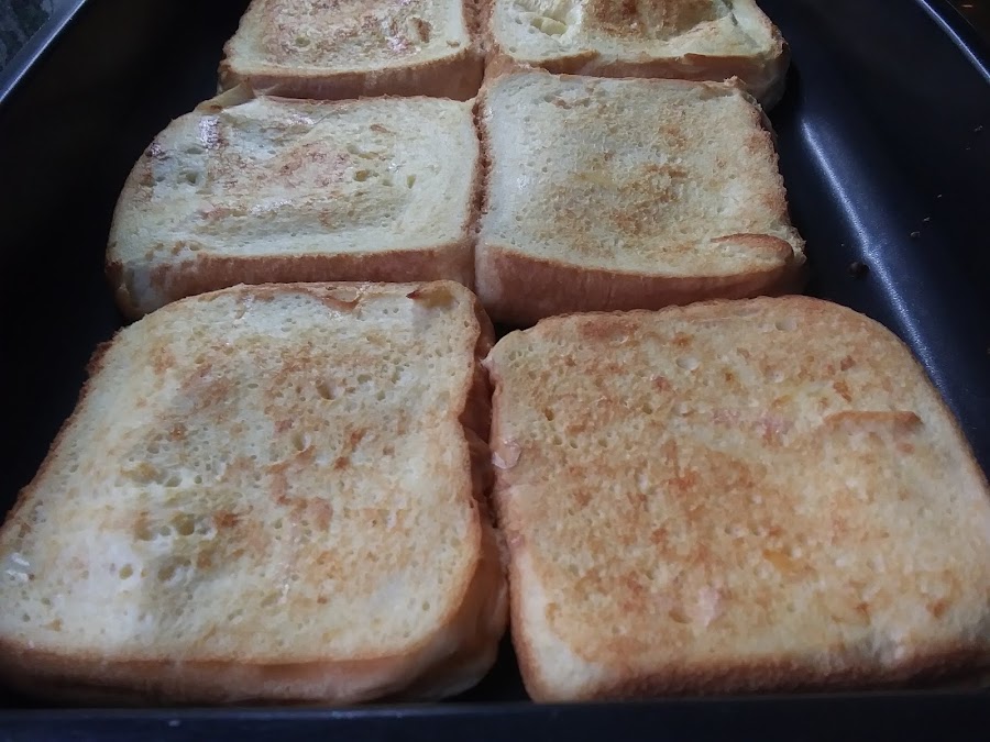 Pasamos las rebanadas de pan por la leche, dándole la vuelta para que se empape por los dos lados y después por el huevo batido. Las colocamos en la bandeja de horno.
