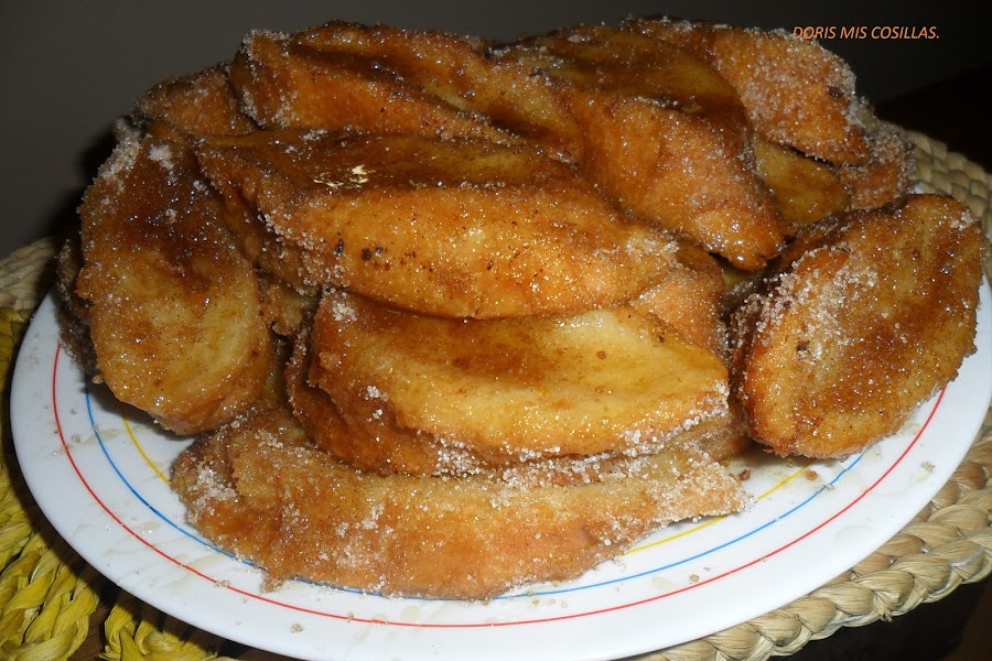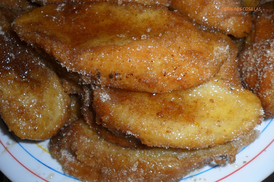 Vamos pasando por huevo,y freímos por tandas, dejamos sobre papel absorbente y acto seguido por la mezcla de azúcar y canela molida, bien rebozadas.