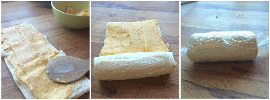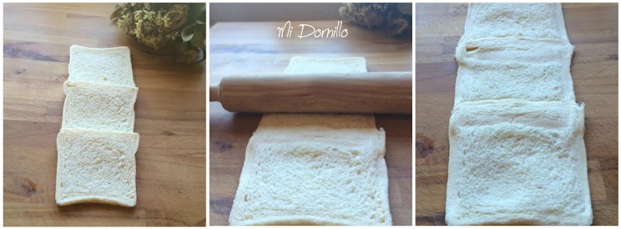 Una vez fría la crema. Cogemos tres rebanadas de pan sin corteza y las ponemos una detrás de otra como vemos en la imagen, y ayudada del rodillo las unimos las tres.