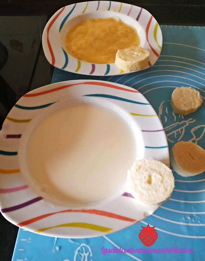 Los sacamos del congelador, y los vamos cortando a rodajas de un cm más o menos. Batimos los huevos y los ponemos en un plato hondo, así mismo con la leche (que le habremos retirado la cascara de limón y la canela). Vamos pasando los rollitos por la leche (que se empapen bien), y por el huevo batido.