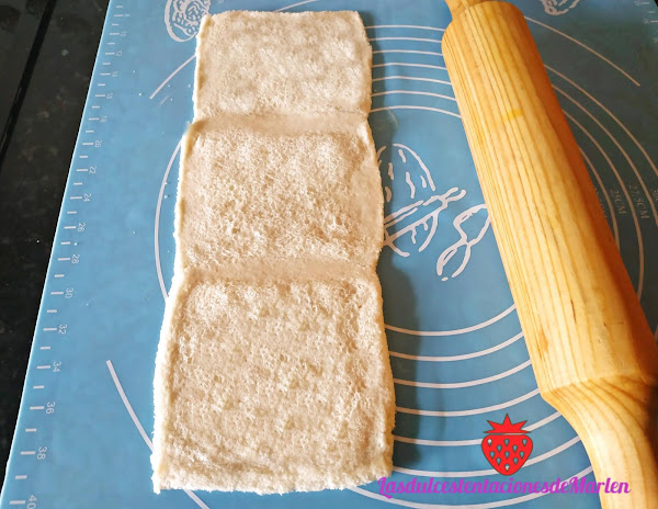 Cogemos 3 rebanadas de pan (no encontré a mano la de los enrollados y use el normal). Se juntan y se estiran con un rodillo hasta que queden finas, a lo largo las tres.