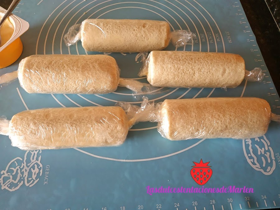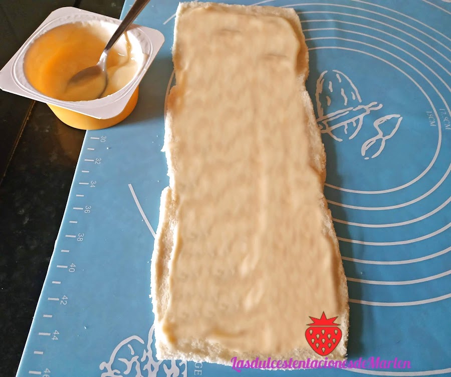Le ponemos las natillas por encima, y vamos enrollando el pan.