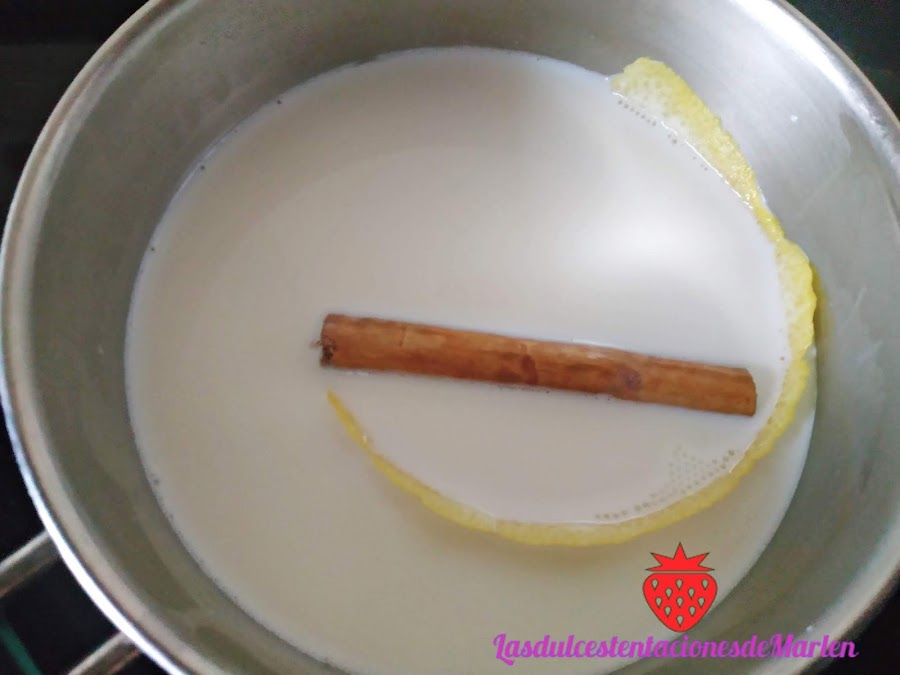 Calentamos la leche con la cascara de limón y la ramita de canela. Llevamos a ebullición y apartamos, dejamos infusionar.