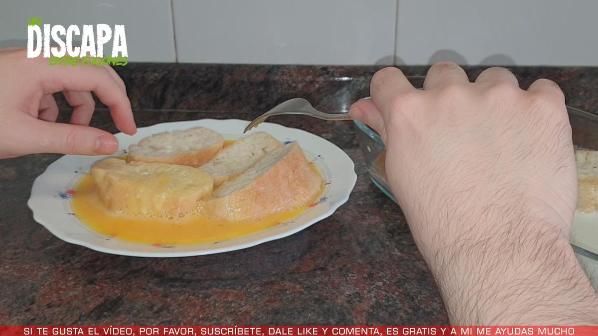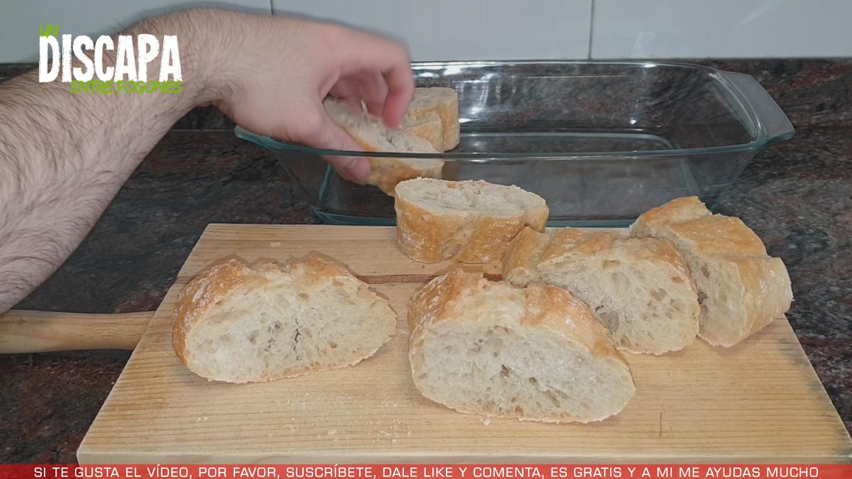 2 Mientras tanto, vamos a cortar el pan. Yo voy a utilizar para del día anterior, hay quien utiliza pan del mismo día, así que eso lo dejo a vuestra elección. Vamos a procurar cortar todas las rodajas del mismo grosor, yo e cortado rodajas de unos 2 dedos de grosor. Colocamos las rodajas de pan en una fuente.