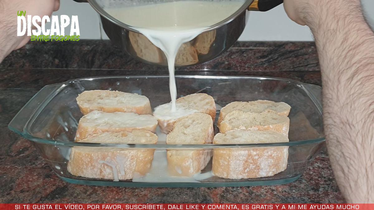 3 Cuando la leche a empezado a hervir, retiramos la cazuela del fuego y vertemos la leche sobre las rodajas de pan. Vamos a procurar que el pan se empape bien. Cuanto más duro sea el pan, más tiempo dejaremos que se empapen de la leche.