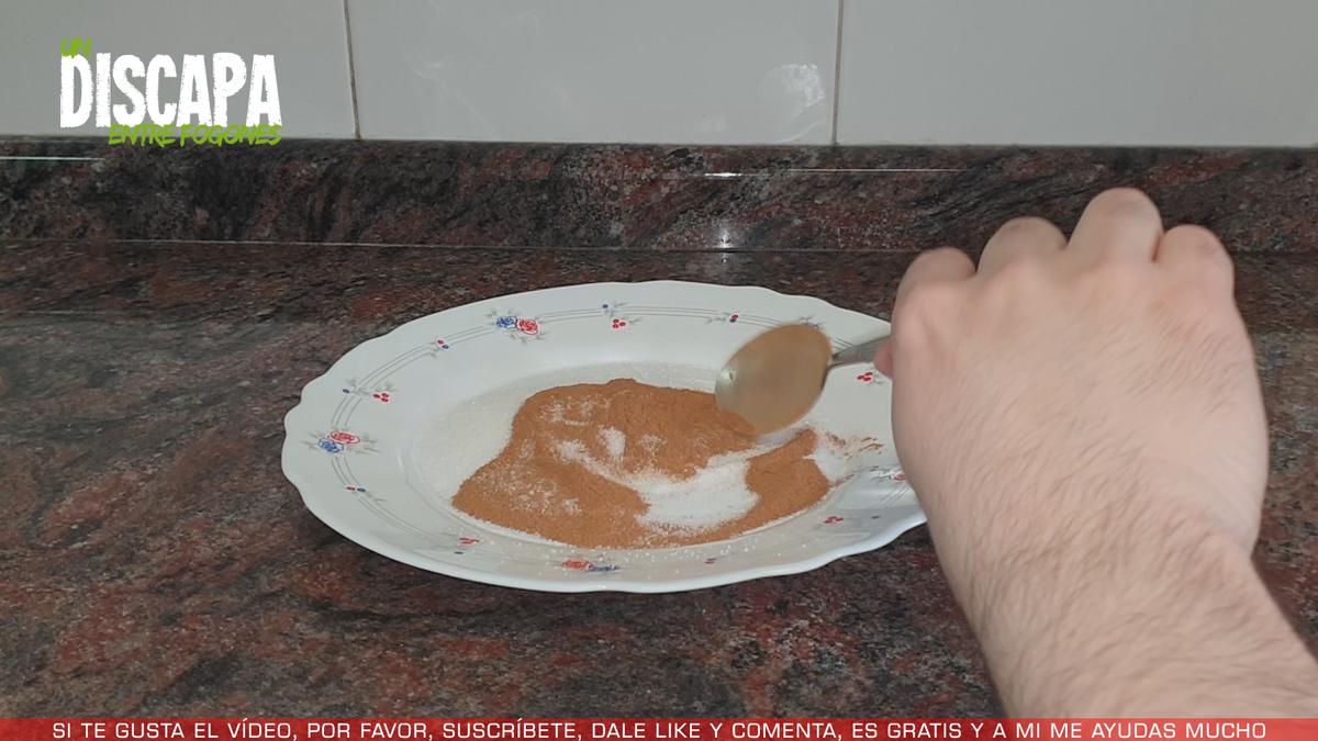 4 Mientras tanto, vamos a mezclar 3 cucharadas de azúcar con una cucharada de canela en polvo. Reservamos para más adelante.