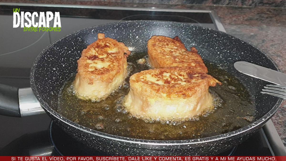 7 Ahora ponemos a calentar una buena cantidad de aceite en una sartén, yo recomiendo poner el fuego alto para que así el pan no absorba demasiado aceite. Añadimos las torrijas y dejamos que se doren. Cuando ya estén bien doradas las retiramos a un plato con papel absorbente para que absorba el exceso de aceite.