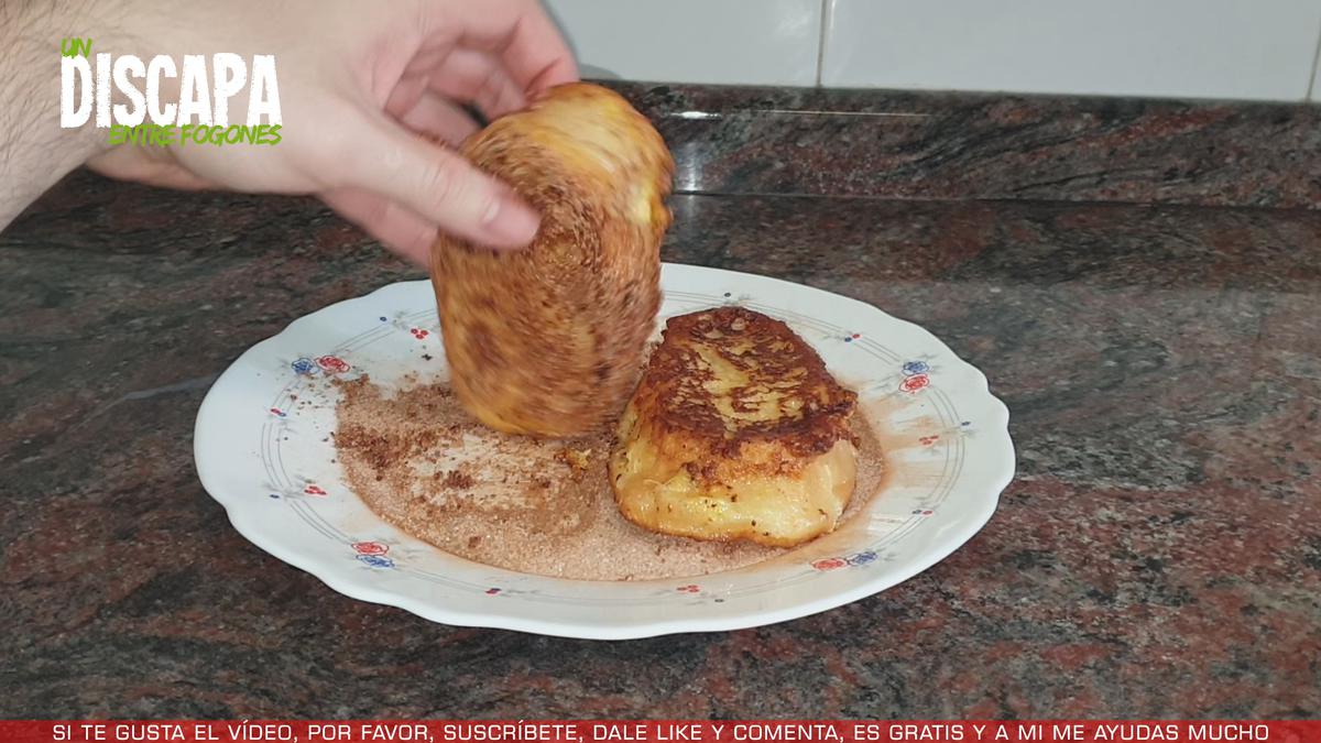 8 Por último, cuando aún están calientes pasamos las torrijas por la mezcla de azúcar y canela. Que se impregnen bien por todos lados.