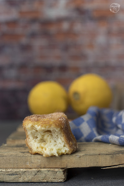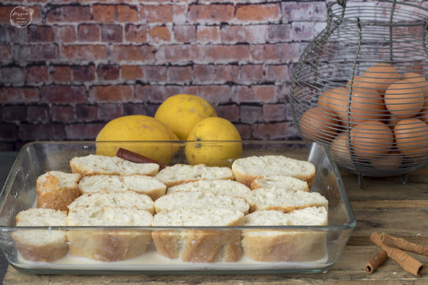 En una olla calentamos la leche junto con el azúcar, las ramas de canela y la piel de limón. Justo cuando empiece a hervir retiramos del fuego y dejamos que se enfríe totalmente. Vertemos una vez fría en una fuente y dentro vamos introduciendo rebanadas de pan (las mías son algo más gruesas de lo habitual porque me gustan las torrijas gorditas).Dejamos durante unos diez minutos para que empapen bien por ese lado.