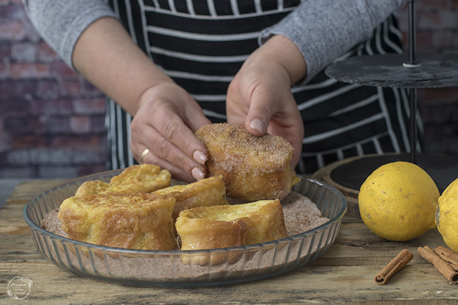 Mezclamos en una fuente azúcar y canela molida y vamos rebozando las torrijas dentro. Disponemos sobre el plato de servicio tapadas, hasta la hora de servir.