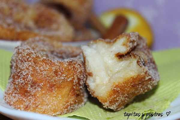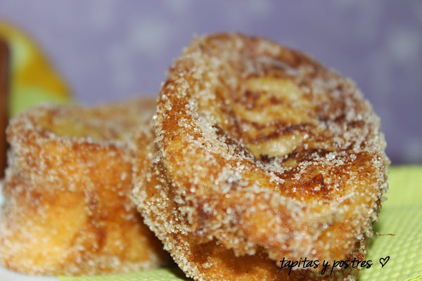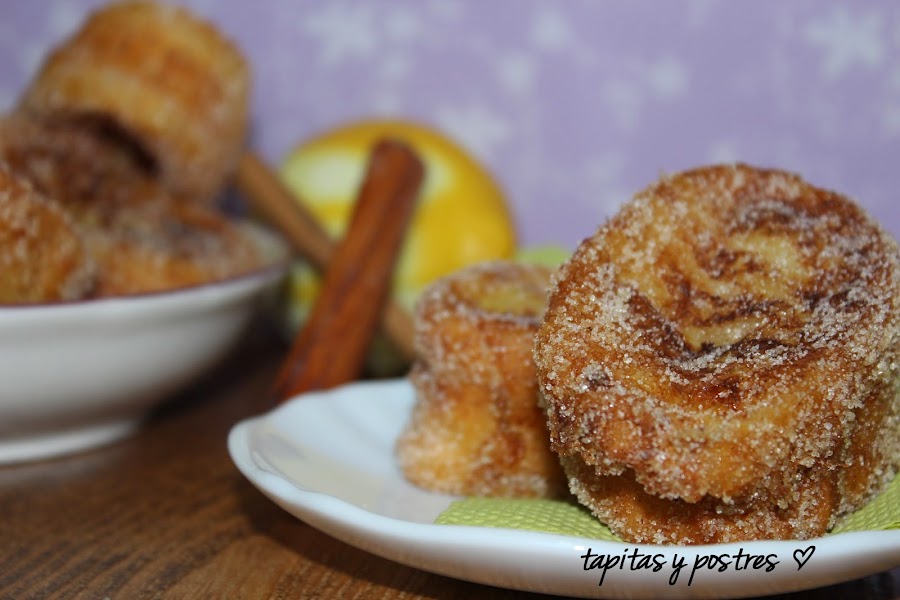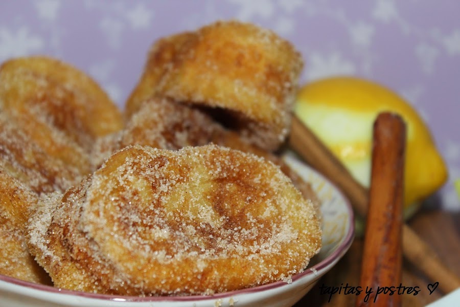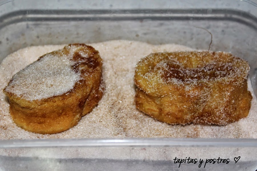Dejamos que escurran un poco el aceite sobre papel de cocina y las pasamos por una mezcla de azúcar y canela en polvo que tendremos preparada.