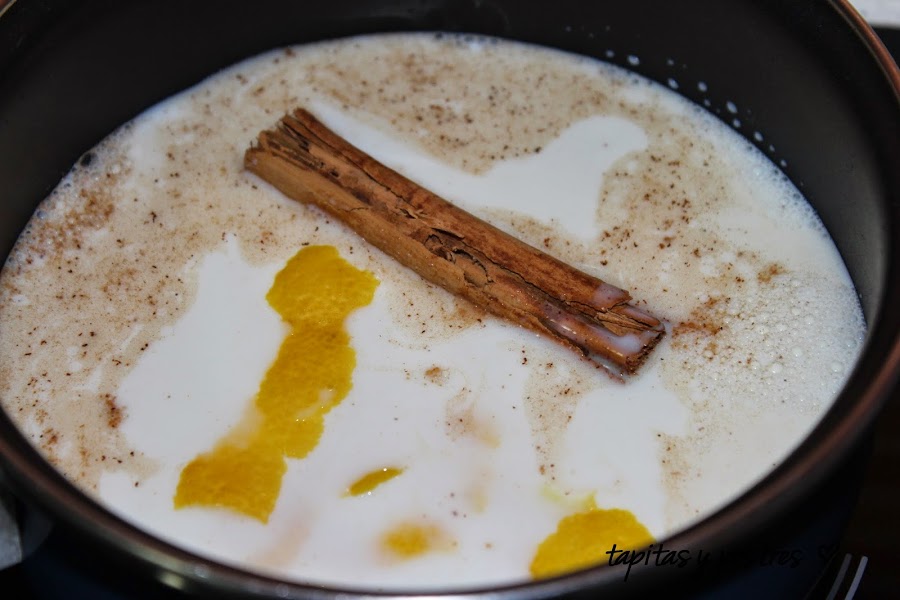 En un cazo ponemos la leche, con 25 de los 100 gr de azúcar. Añadimos la cáscara de limón y el palo de canela y calentamos.