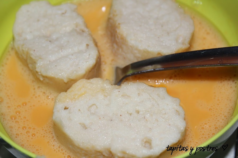 Cuando veamos que las rebanadas están bien empapadas, las sacamos con cuidado y las pasamos por el huevo batido.
