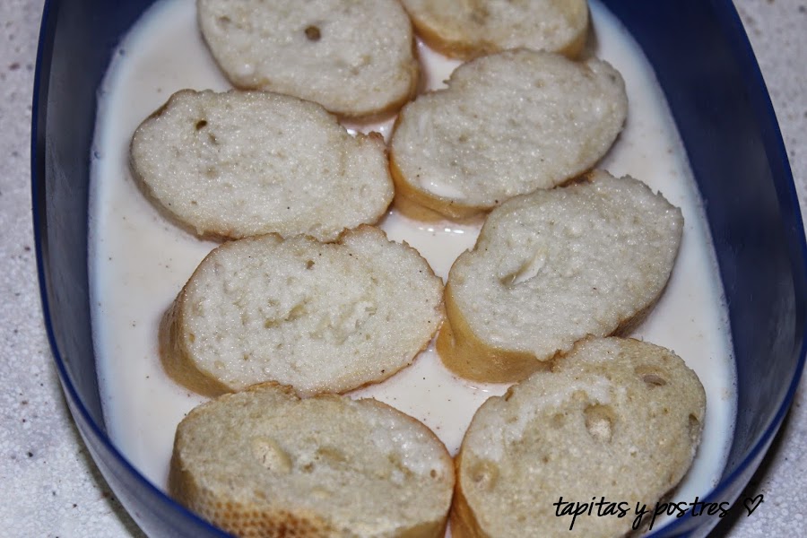 Cuando la leche esté caliente dejamos templar un poco y la vertemos sobre las rebanadas de pan. Damos la vuelta para que se mojen bien.