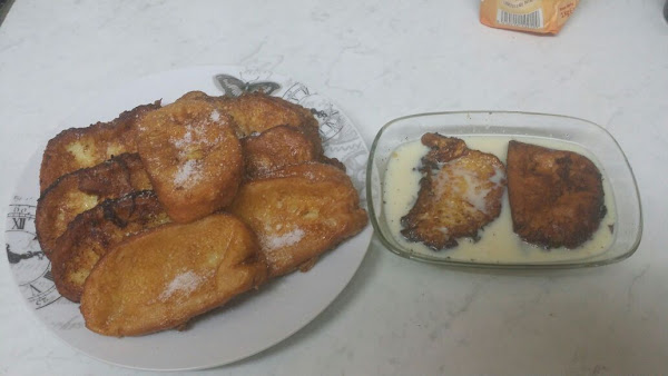 Para terminar este postre y servirlo a vuestros amigos y familiares puede ser de miles de maneras, la más tradicional es espolvoreando un poco de azúcar por encima. La que ha hecho mi madre toda la vida es hacer más cantidad de leche con canela y cascara de limón y sumergirlas dentro de la leche (Me chiflan así).