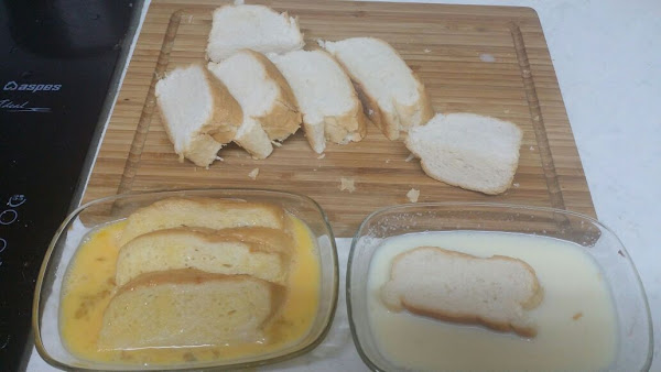 Una vez la leche en el recipiente y tibia (por lo menos, que no tenemos los callos del cocinero profesional), cogemos una rebanada de pan y la pasamos primero por la leche y segundo por el huevo batido. Por último, freímos en aceite muy caliente. (Por lo tanto antes de ponernos a pasar rebanadas de pan por la leche y los huevos debemos poner aceite a calentar.)