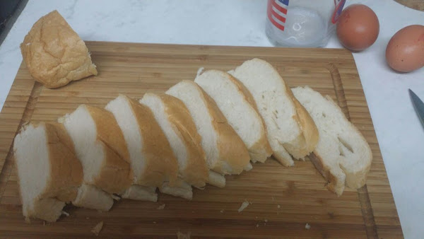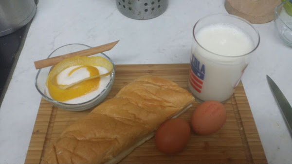 Esto se puede ir haciendo mientras la leche esta en el fuego o después mientras se enfría un poco, cortamos el pan en rebanadas. Se nos olvido decir que el pan no tiene que ser pan del día sino que queda mejor si fue comprado días antes y ya está un poco duro, o en su defecto que fue lo que hicimos nosotros comprar pan especial para torrijas.
