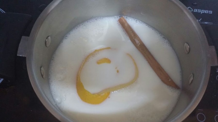 En un cazo ponemos la leche con la canela, la cascara de limón y azúcar, la dejamos hasta que rompa a hervir (eso es cuando a la leche le salen las burbujitas). Tened cuidado porque la leche tiende a subir cuando hierve. La dejamos 2 minutos hirviendo y la retiramos.