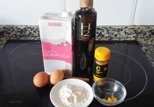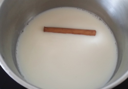 Pon la leche en un cazo. Añade la corteza de limón y la rama de canela (si es muy grande puedes cortarla por la mitad).