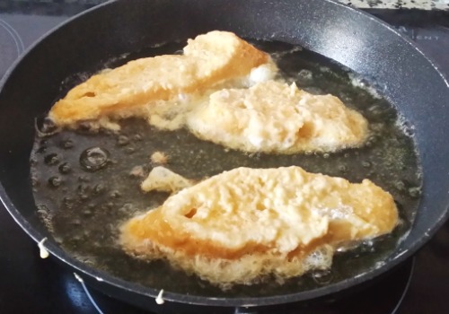 Calienta una sartén con el aceite y fríe las torrijas, 1 minuto por cada lado, hasta que se doren.