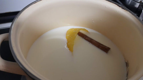 Dejamos la leche infusionando a fuego muy bajo hasta que rompa a hervir momento en el que apagaremos el fuego y retiraremos la canela junto con la piel de limón y dejamos enfriar la leche.