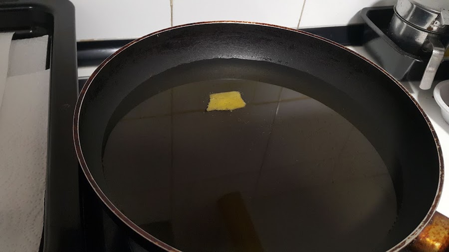 Ponemos a calentar aceite, le añadimos un poco de piel de limón y, cuando empiece a burbujear, lo retiramos.