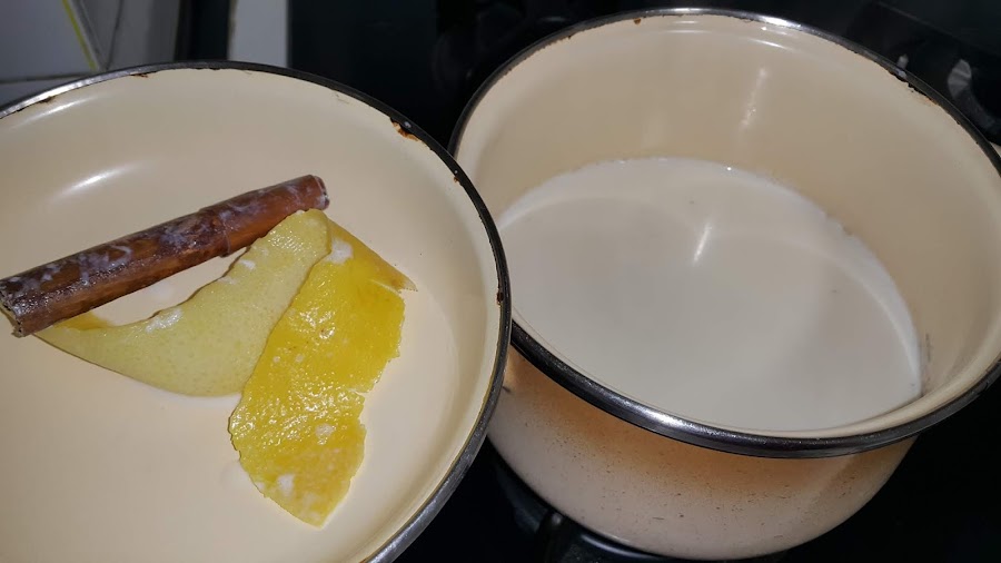 Para ello ponemos un cazo al fuego y le añadimos 1 litro de leche, un poco de canela en rama, 2 cucharadas de postre de esencia de vainilla y la piel de un limón sin nada de parte blanca para que no amargue. La mejor manera para sacar la piel lo más limpia posible es con un pela verduras.