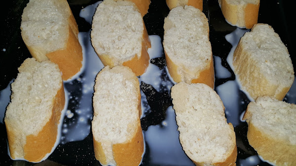 En una fuente de horno amplia ponemos las rebanadas de pan cortadas a unos 2 centímetros de grosor.