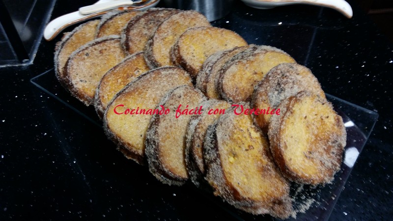 Después de que escurran sobre el papel se van pasando por la mezcla del azúcar y canela y colocando en otra fuente, ya bien puestas y monas para la foto, total, para lo que duran así
