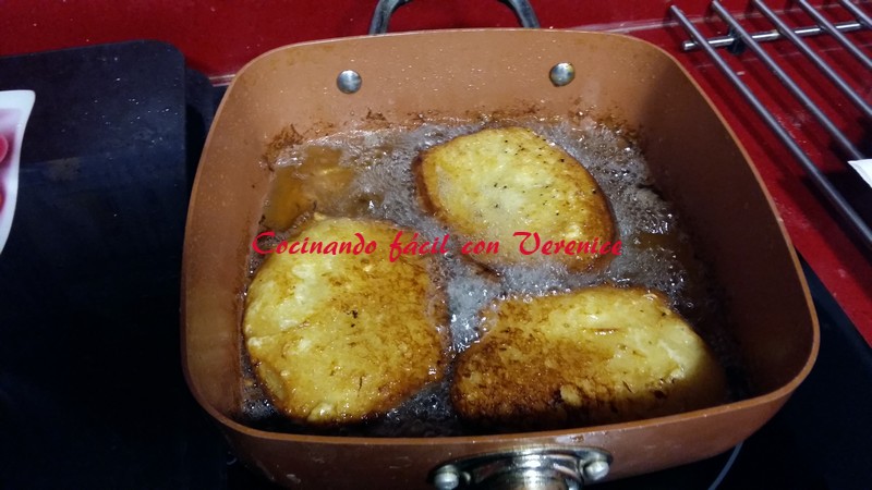 Caliente ya el aceite, empezamos a sacar con una paleta escurridora las rebanadas y dejamos que suelte el sobrante de mezcla, para que no salpique. Se van echando en la sartén y vamos dando vueltas mientras se doran.