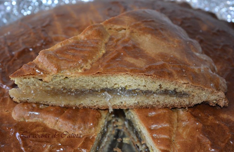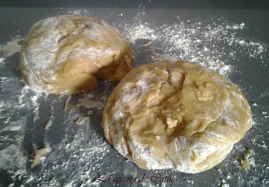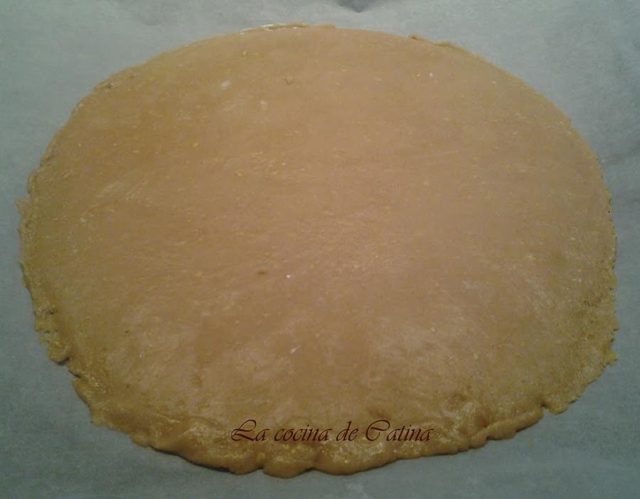 Hacer dos partes, estirar la masa sobre un papel de horno enharinado para que luego sea más fácil colocarlo en la bandeja, estirarla con el rodillo hasta dejarla mas o menos de medio centímetro de grosor, a continuación se corta un disco de 18 o 20 centímetros de diámetro. Colocar en la bandeja de horno y cubrir con el cabello de ángel, dejando un centímetro alrededor de todo el círculo sin cubrir de cabello, esta orilla la pintamos con huevo batido.