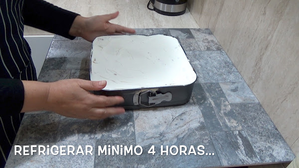 Una vez llegues al borde del molde cubre por encima con crema chantilly y luego guarda tu torta cubierta con plastico de cocina en el refrigerador no congelador, por al menos 4 horas o toda la noche.