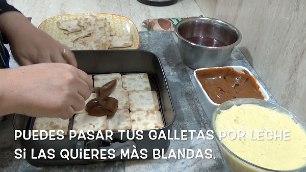 Reparte muy bien el manjar por encima de las galletas. Y coloca otra capa de galletas y crema pastelera, reparte muy bien por todo el molde.