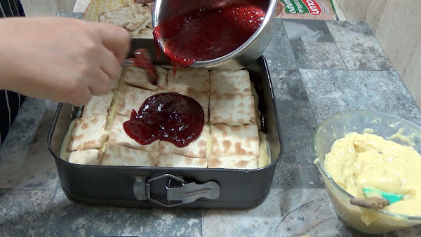 Luego agrega otra capa de galletas y mermelada de frambuesa reparte muy bien.