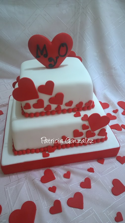 Torta de Aniversario de Bodas de dos piso forrada en fondant, y los corazones hechos de pasta de goma; bizcochuelo de vainilla y chocolate, rellena de dulce de leche y crema de maní.....
