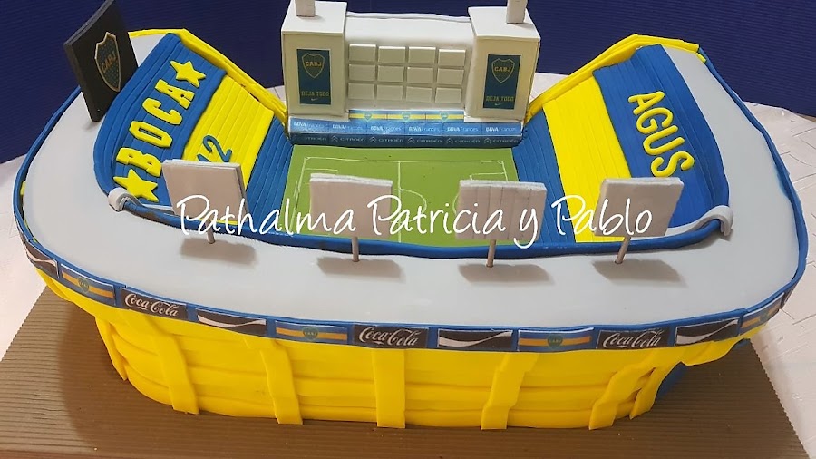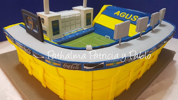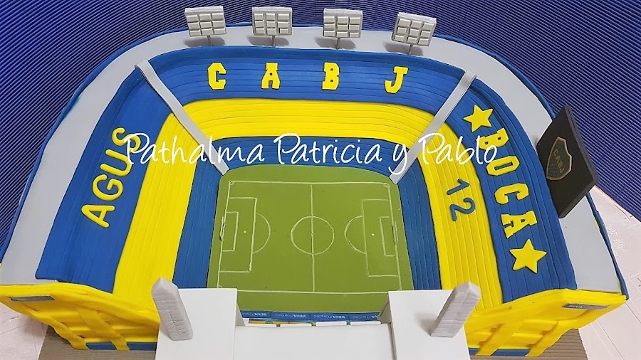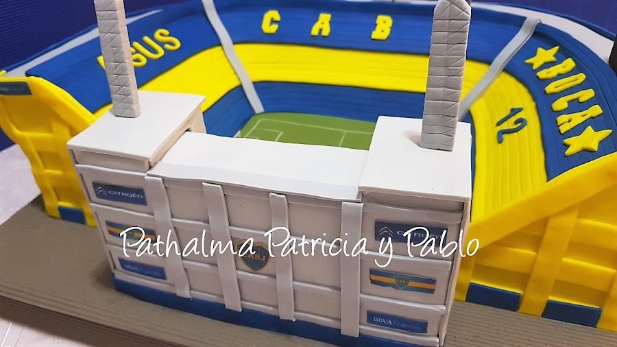 Torta cancha de Boca: Forrada de Pasta de Fondant, con detalles de pasta de goma y otros en laminas comestibles de papel de arroz y tinta vegetal, pegadas con agua mediante un rociador para humedecer levemente la lamina... bizcochuelo de chocolate, relleno y ganache de chocolate.....