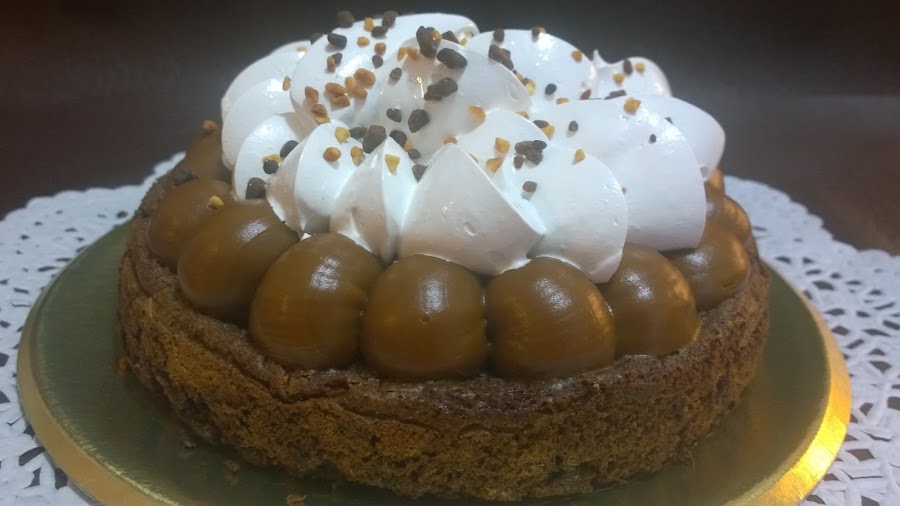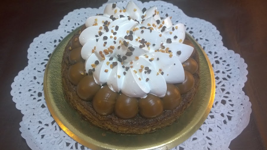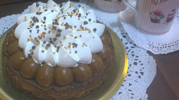 4. Para el armado, sobre el brownie, tomamos una mangas y hacemos unos copos de dulce de leche; por encima el merengue Italiano, y como toque final…. Podemos decorar,con mini chips o... espolvoreando con chocolate y nuez finamente picada.