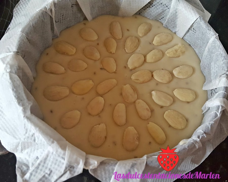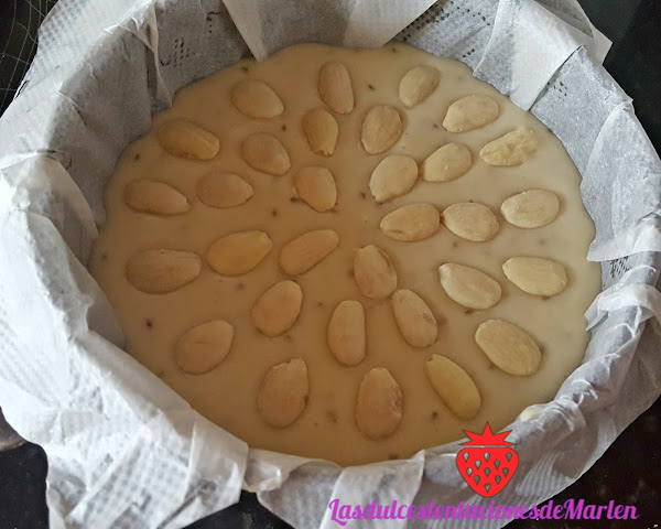 Ponemos la mezcla en el molde y vamos poniendo por encimas las almendras.