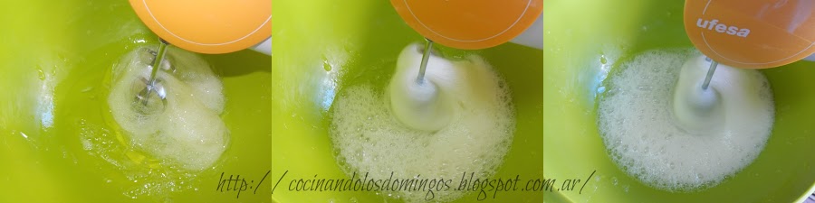 agregar poco a poco los 3/4 de taza de azúcar restantes y batimos hasta que este firme (5 minutos aproximadamente) con cuidado de no pasarse ya que las claras se pueden separar.