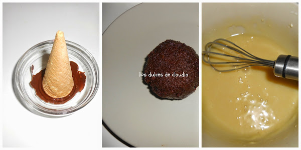 Rellenar y cubrir el bizcocho, poner la bola de bizcocho y luego el chocolate blanco, antes de que seque poner el cucurucho y decorar. Para que se sostenga el cucurucho poner por detrás unos palillos hasta que seque.
