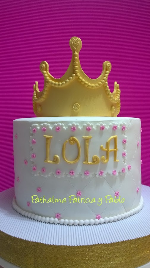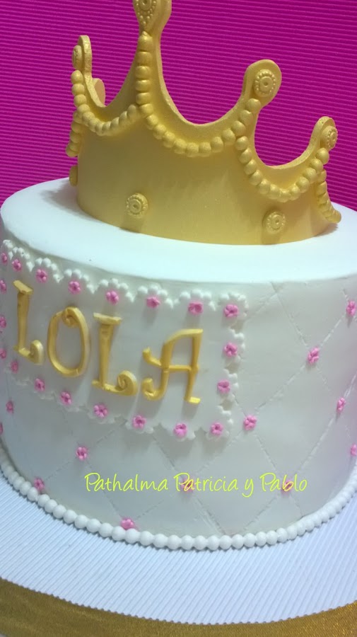 Corona de princesa y detalles de perlas todo en pasta de goma, torta básica de bizcochuelo de chocolate, relleno con ganache de chocolate, forrada en fondant.....