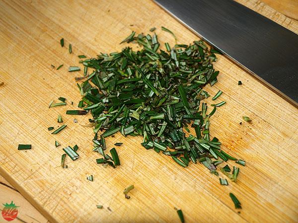 Para empezar, cortamos el romero, lo lavamos y dejamos secar. Cuando esté seco, los deshojamos y lo picamos bien fino. Después, pelamos el ajo, eliminamos el corazón y lo machacamos en un mortero. Lo mezclamos con el romero picado y los reservamos.