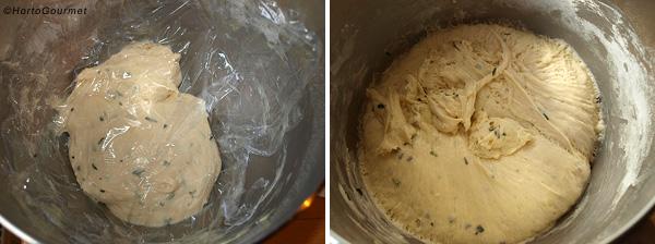 Después, ponemos el agua tibia con la levadura y el azúcar en un cuenco. Mezclamos y dejamos reposar 15 minutos. Mientras tanto, en el bol (de batidora/amasadora o normal) donde vamos a preparar la masa, tamizamos la harina. Pasados los 15 minutos añadimos al bol la mezcla del agua, el aceite de oliva, la sal y el ajo con romero que teníamos reservado. Amasamos a velocidad 2 o baja durante 10 minutos. Cubrimos la masa con papel film y dejamos reposar 1 hora.