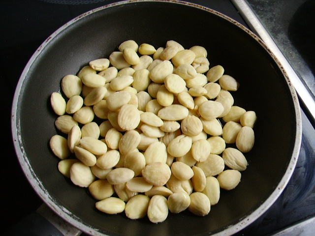 1.- Doramos las almendras en una sartén con un poco de aceite y reservamos.