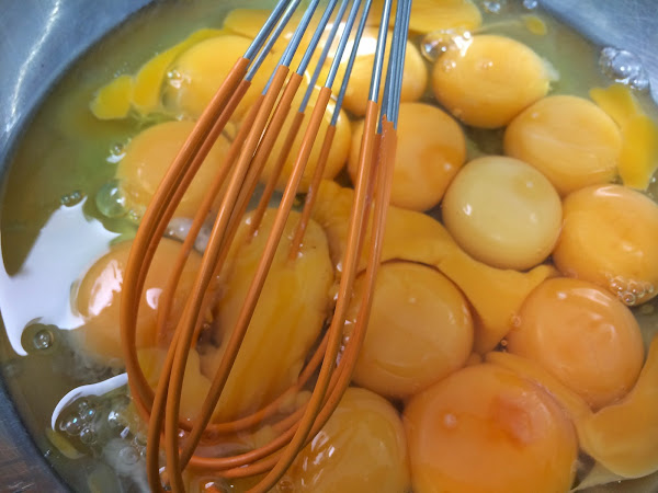 Batimos dos huevos con la clara junto con 16 yemas a las que le añadimos 18 cucharadas de azúcar. Deben quedar muy bien emulsionados así que recomiendo usar una batidora eléctrica.
