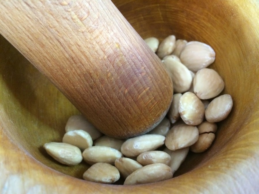Cuando se enfríen las almendras las trituramos en tandas con el mortero hasta que queden muy bien majadas.