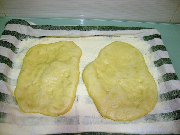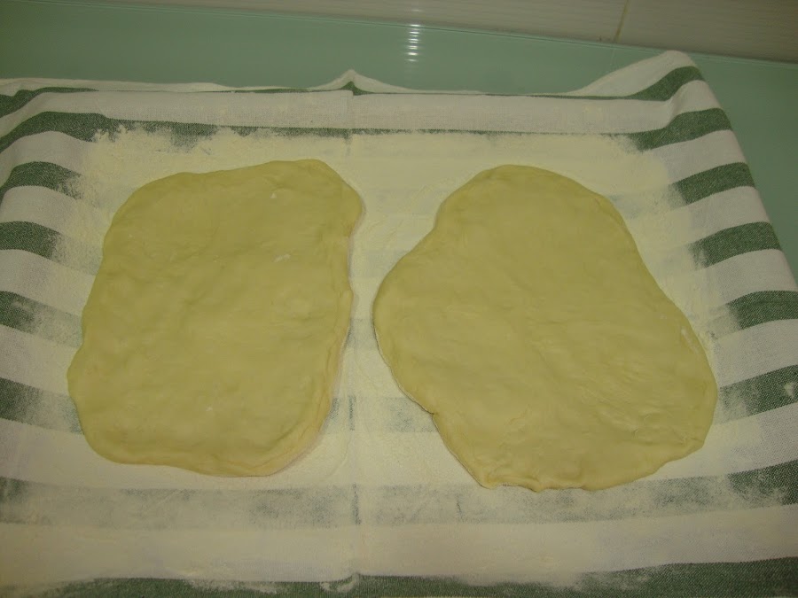 Dividimos en dos la masa, la estiramos hasta un grosor de unos dos centímetros y ponemos sobre un paño cubierto de harina y lo volvemos a tapar con un paño húmedo para que fermente durante unas dos horas.