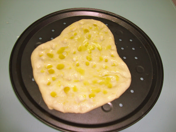 Hacemos unos hoyos en la masa con los dedos y pintamos el pan generosamente con aceite de oliva.