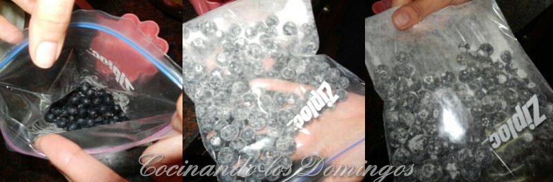 Pasamos los arándanos por harina para que no se asienten en la mezcla al momento de ser horneados, lo pueden hacer en un recipiente; a nosotros nos resulta mas fácil hacerlo en una bolsa.